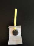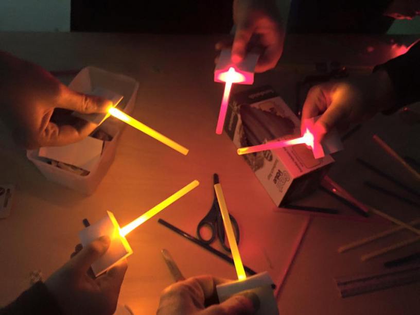DesignMakeTeach had VSTE Conference members make pocket light sabers, and we fell in love with the idea. We have been handing out kits to make your own at a few conferences lately. They are very easy to make using an LED, a coin cell battery, a small (business card-sized) piece of tagboard, a straw, and small piece of double sided foam tape. The directions (in pictures) are below.