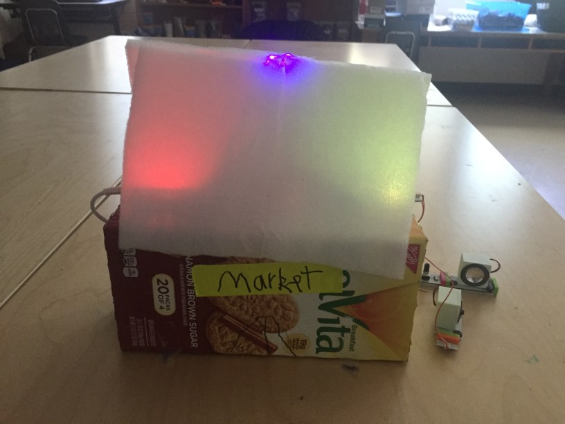 Here is a video of their final creation, a city called “Town,” complete with music and lights (to attract people of course)…some of which could be remotely triggered using a wireless transmitter and receiver. There’s a giant pool, jail, market, working drawbridge, lake, light house, music shop, hospital, and more. They even created a sewer system which I forgot to film. So impressed with their creativity!